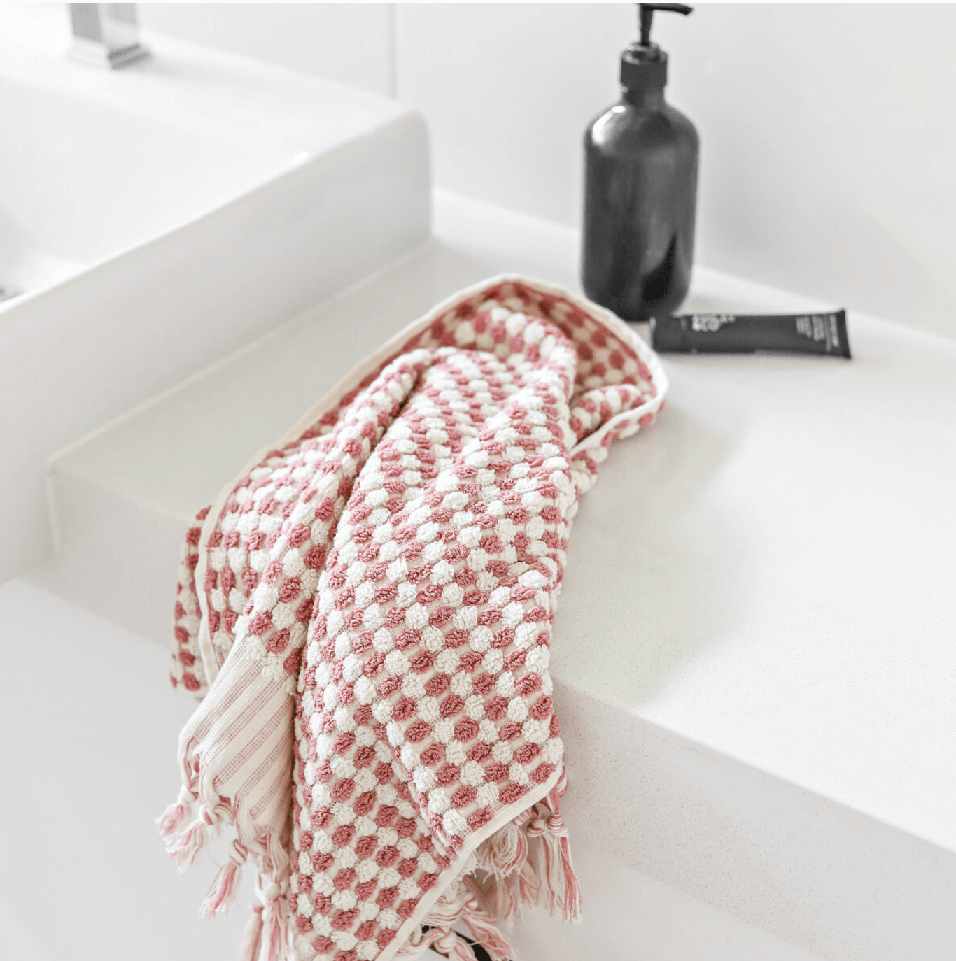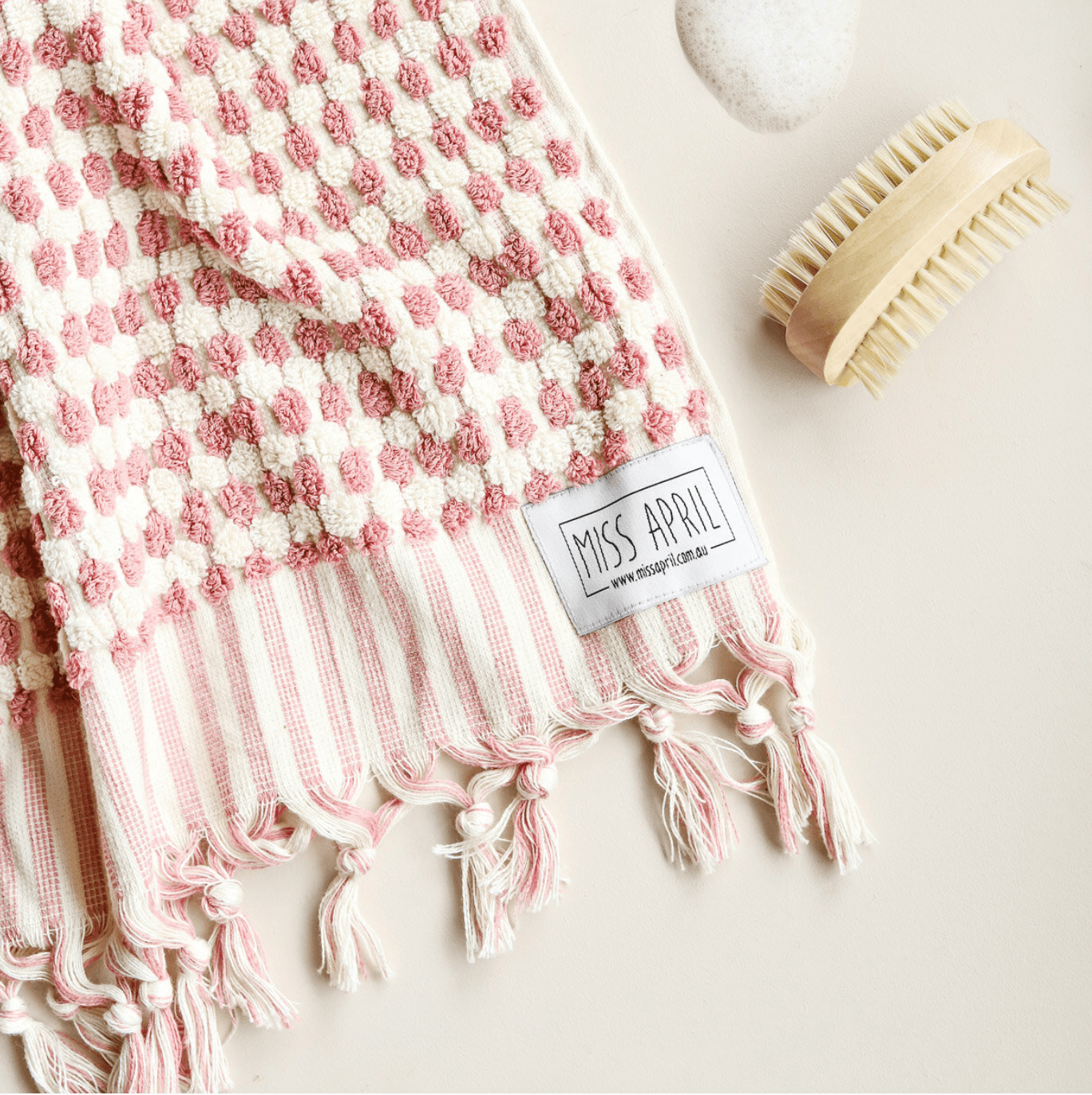 Luxurious Pink and White towel made from rows of pom poms with hand twisted tassels/fringes - super absorbent and fast drying.
