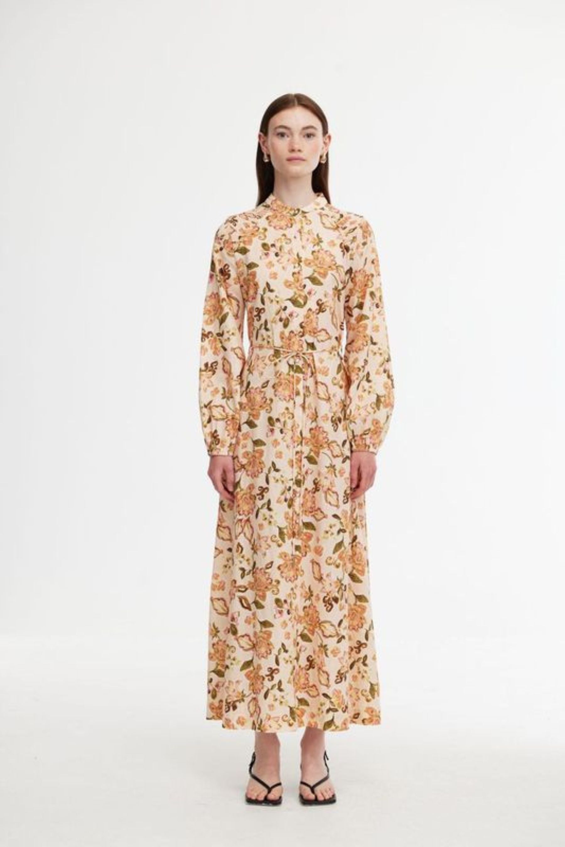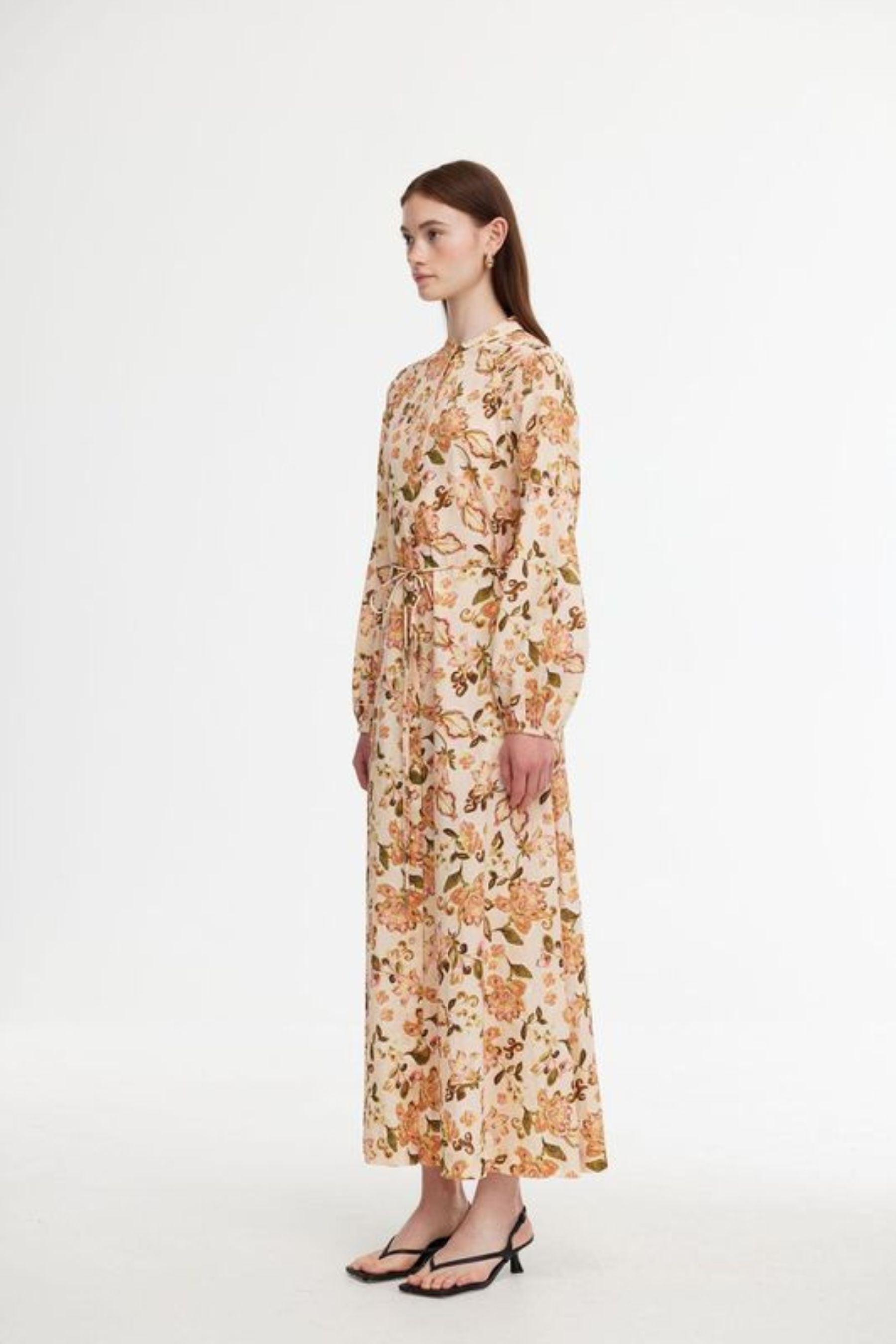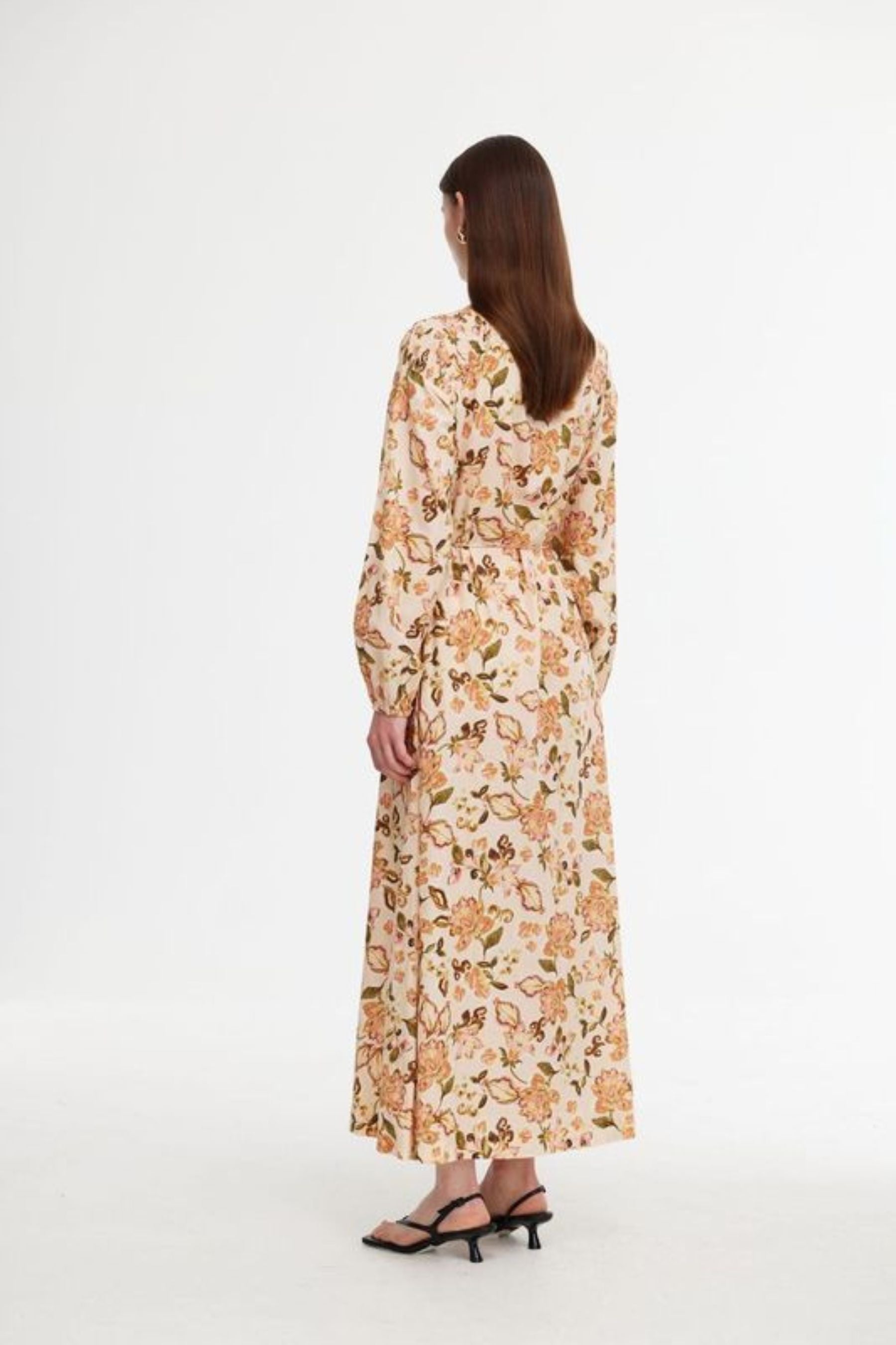 Introducing the Posey Dress in Garden Print – a beautiful, full-length dress that exudes effortless elegance. Designed with long sleeves and a stunning floral print in warm, orangey tones, this dress brings a vibrant, feminine touch to your wardrobe. The soft, flowing fabric drapes beautifully, making it perfect for any occasion.