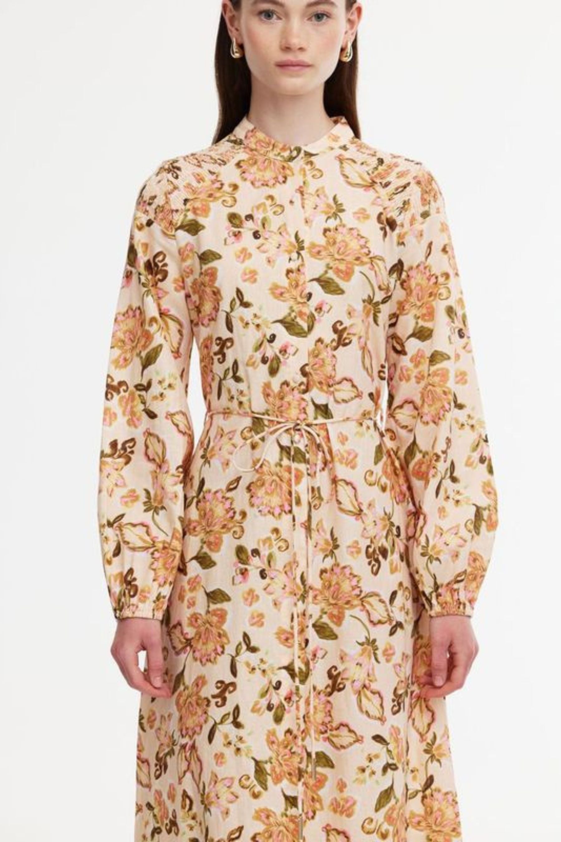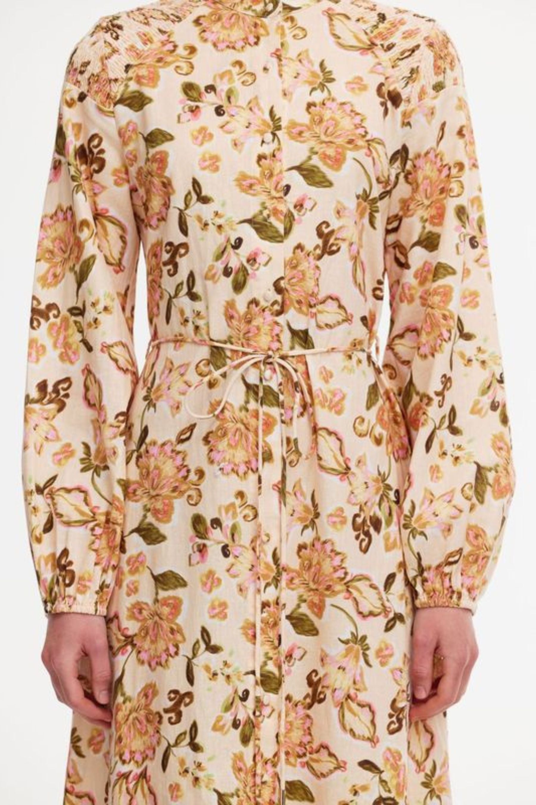 The Posy Dress features a flattering tie around the waist, allowing you to cinch the silhouette for a more defined shape, or leave it loose for a relaxed, flowing look. The intricate garden print adds a touch of romance, while the long sleeves offer a bit of coverage, making this dress perfect for both casual and more formal settings.