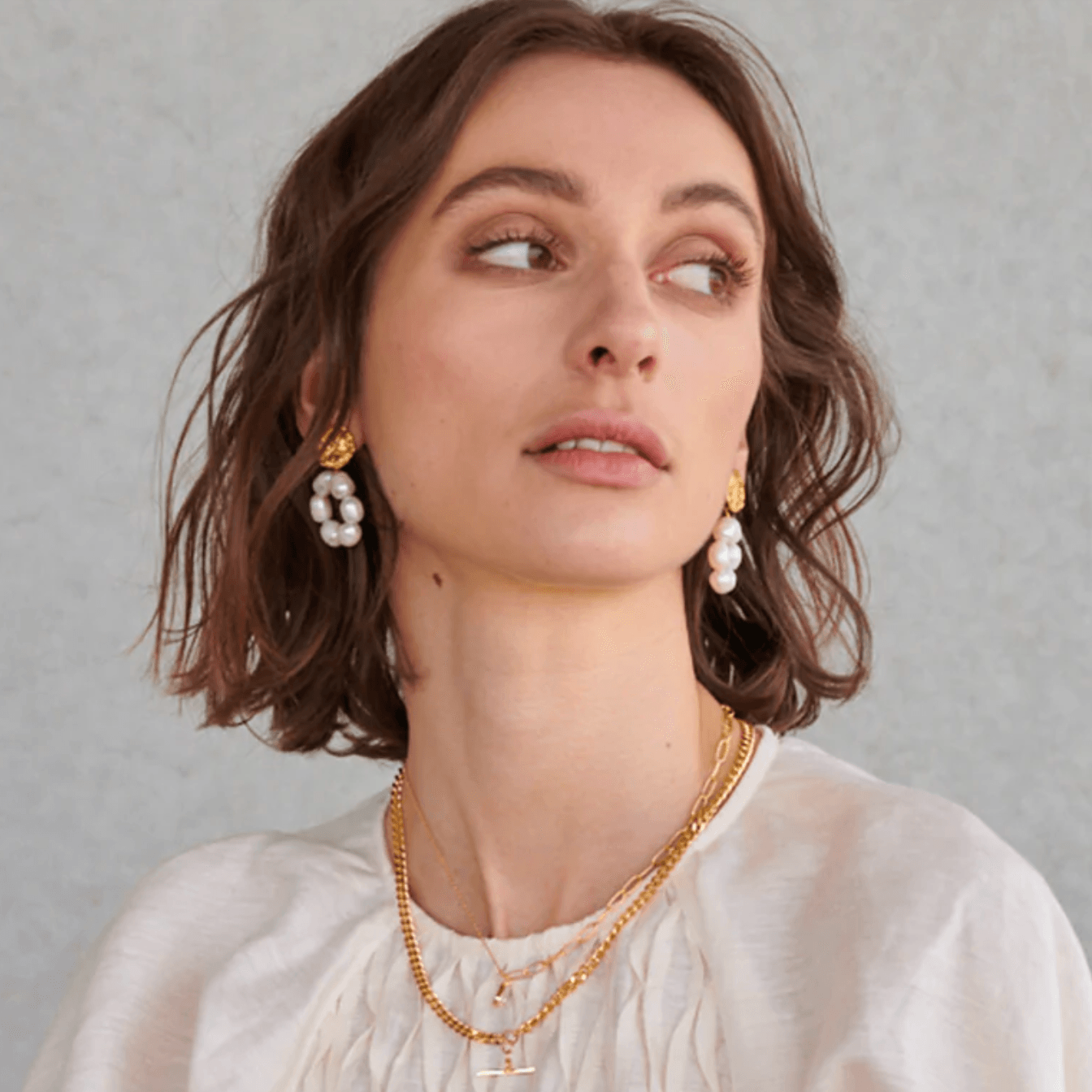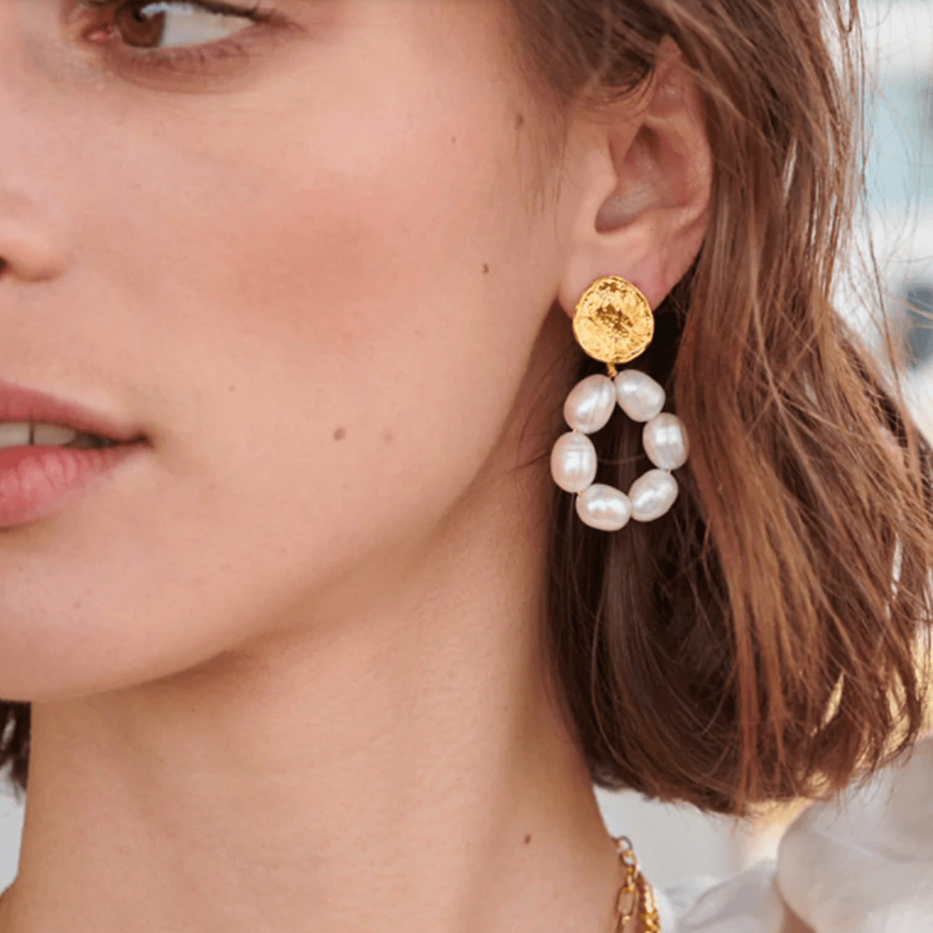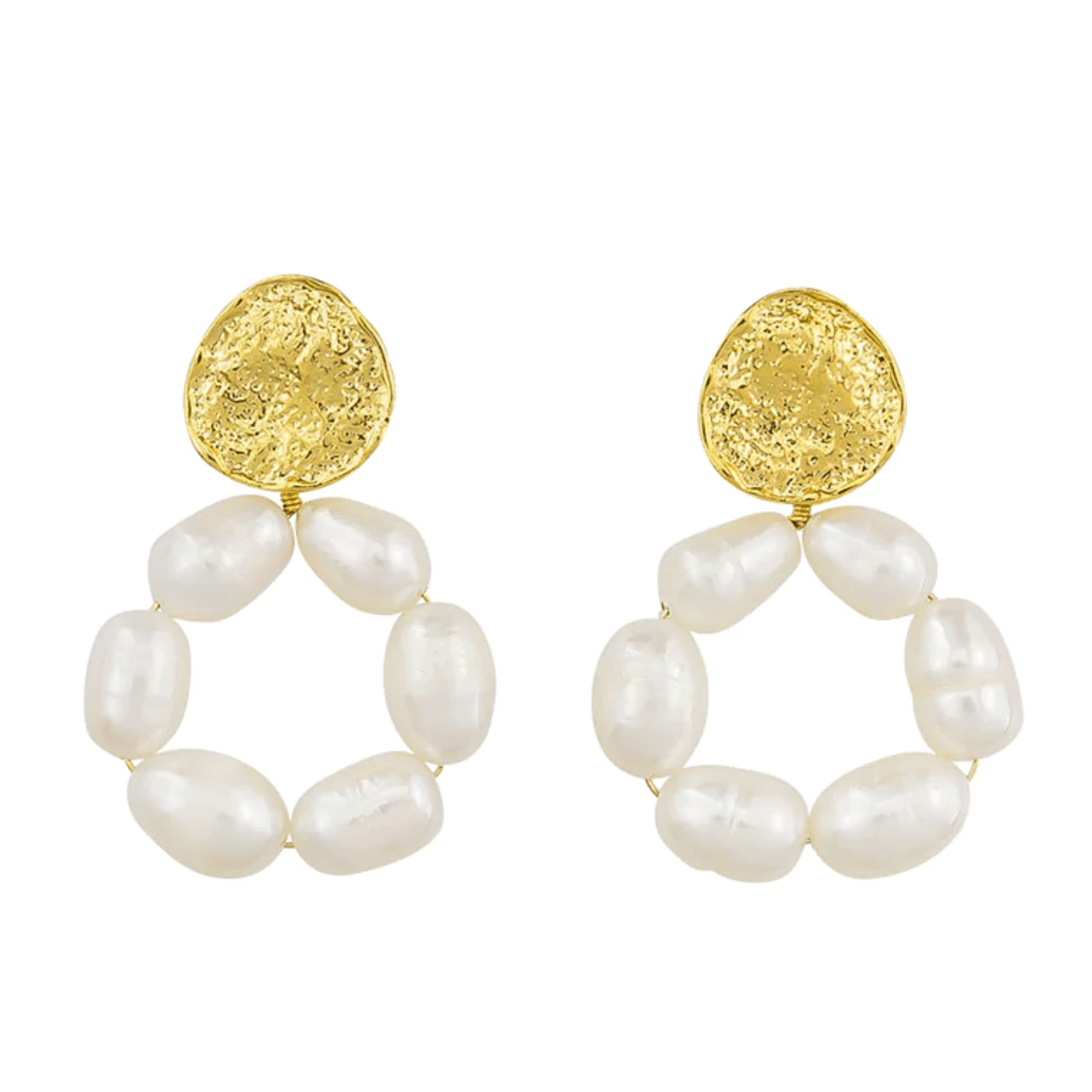 The Sarah Pearl Earrings feature a textured top with fresh water pearls. A luxe style perfect for a wedding or special occasion.