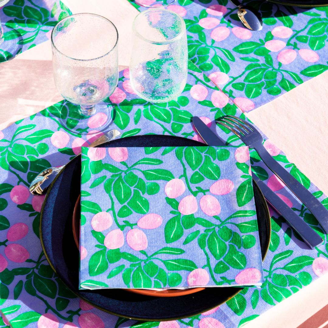 A large napkin with a plum tree print in shades of mauve and green on a lovely sky-blue background.