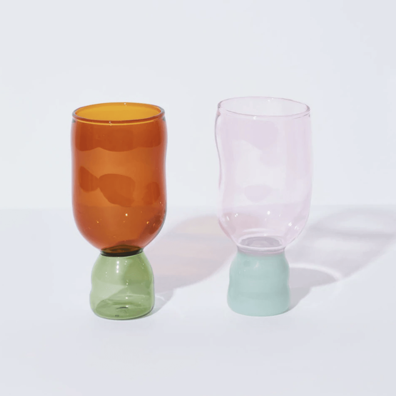 Two toned borosilicate drinking glasses including: Pink vessel and milky aqua base + amber vessel and green base.