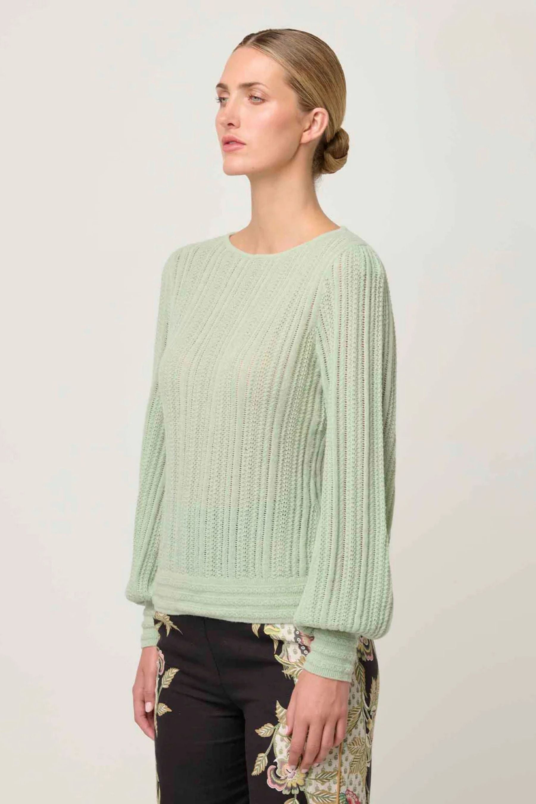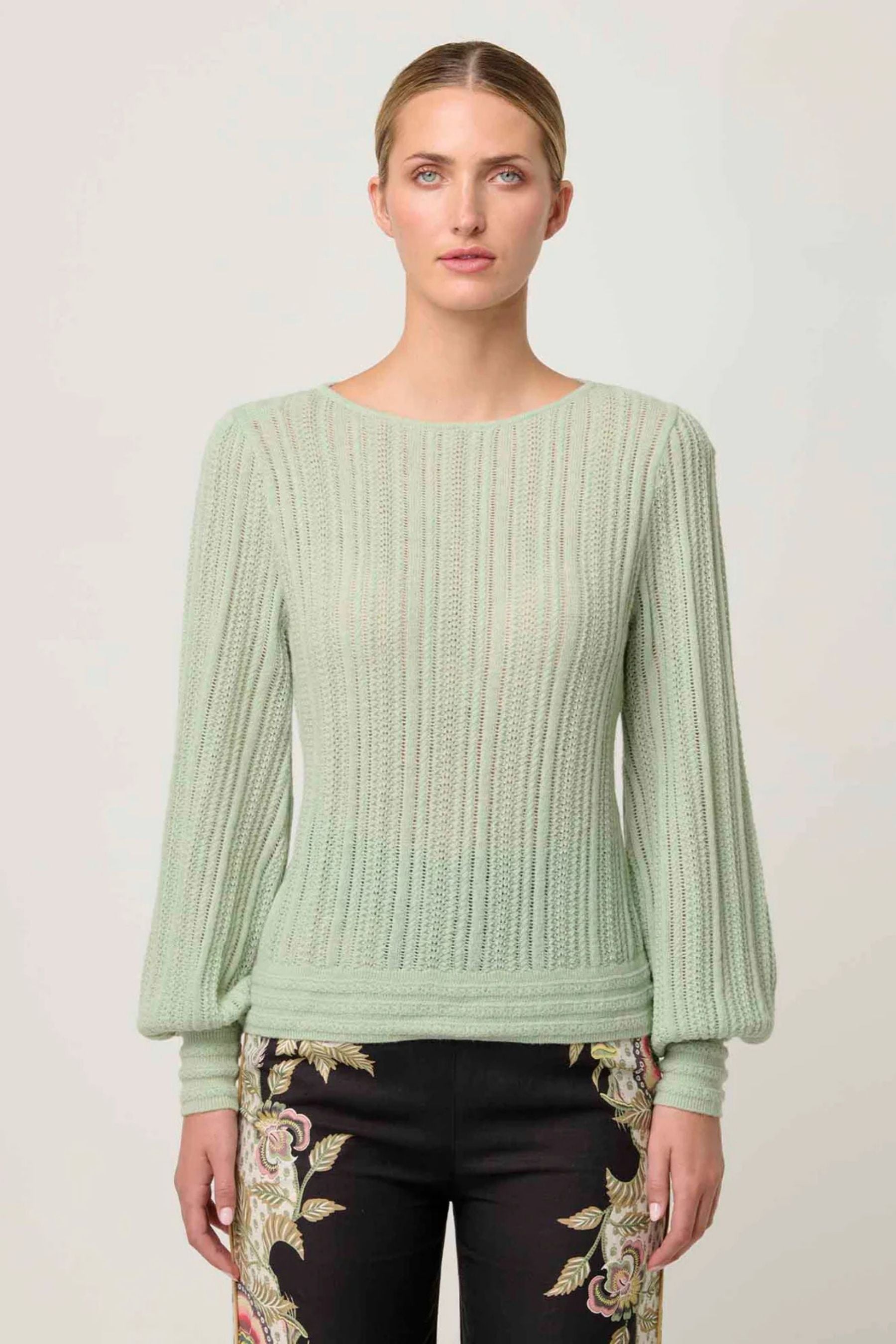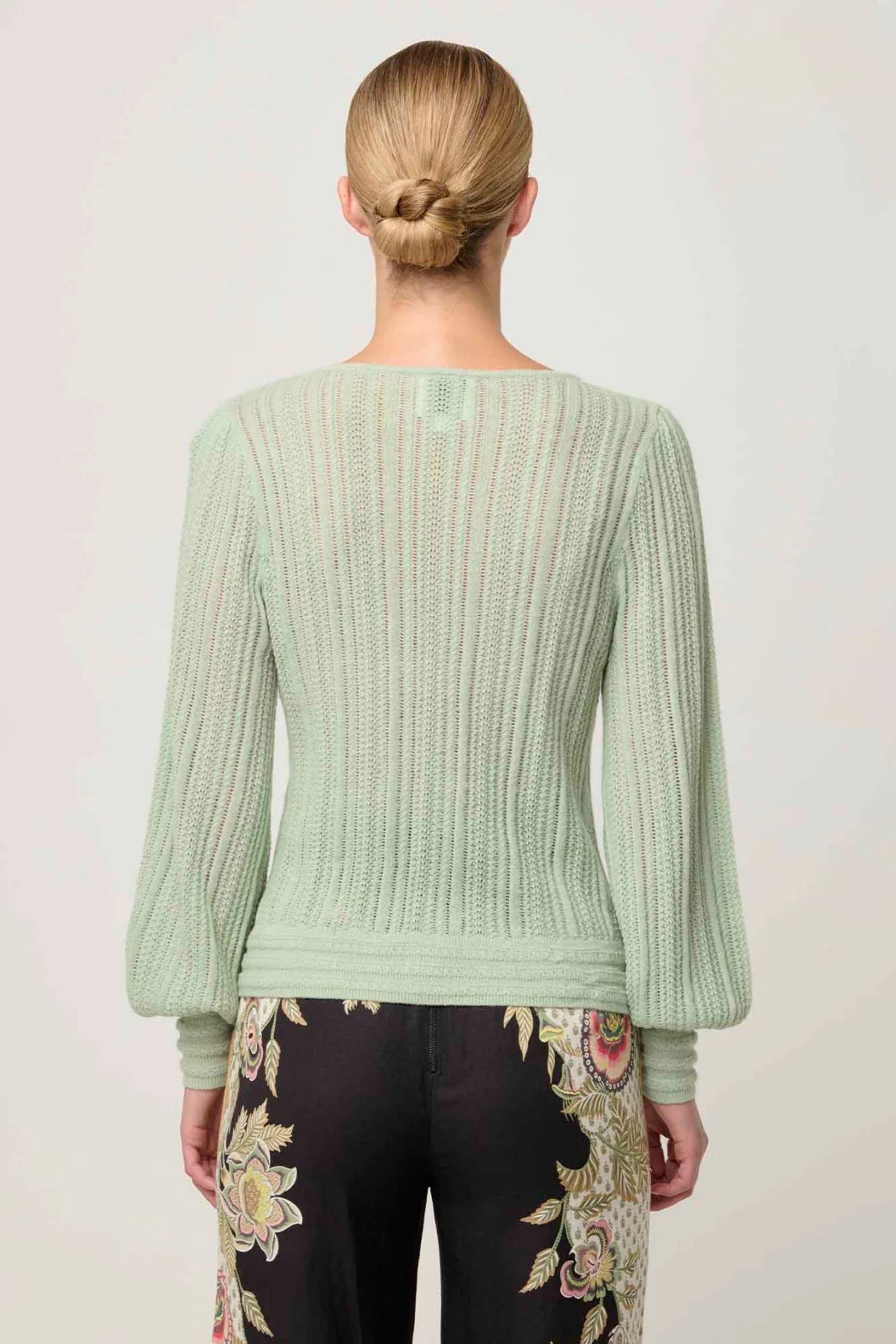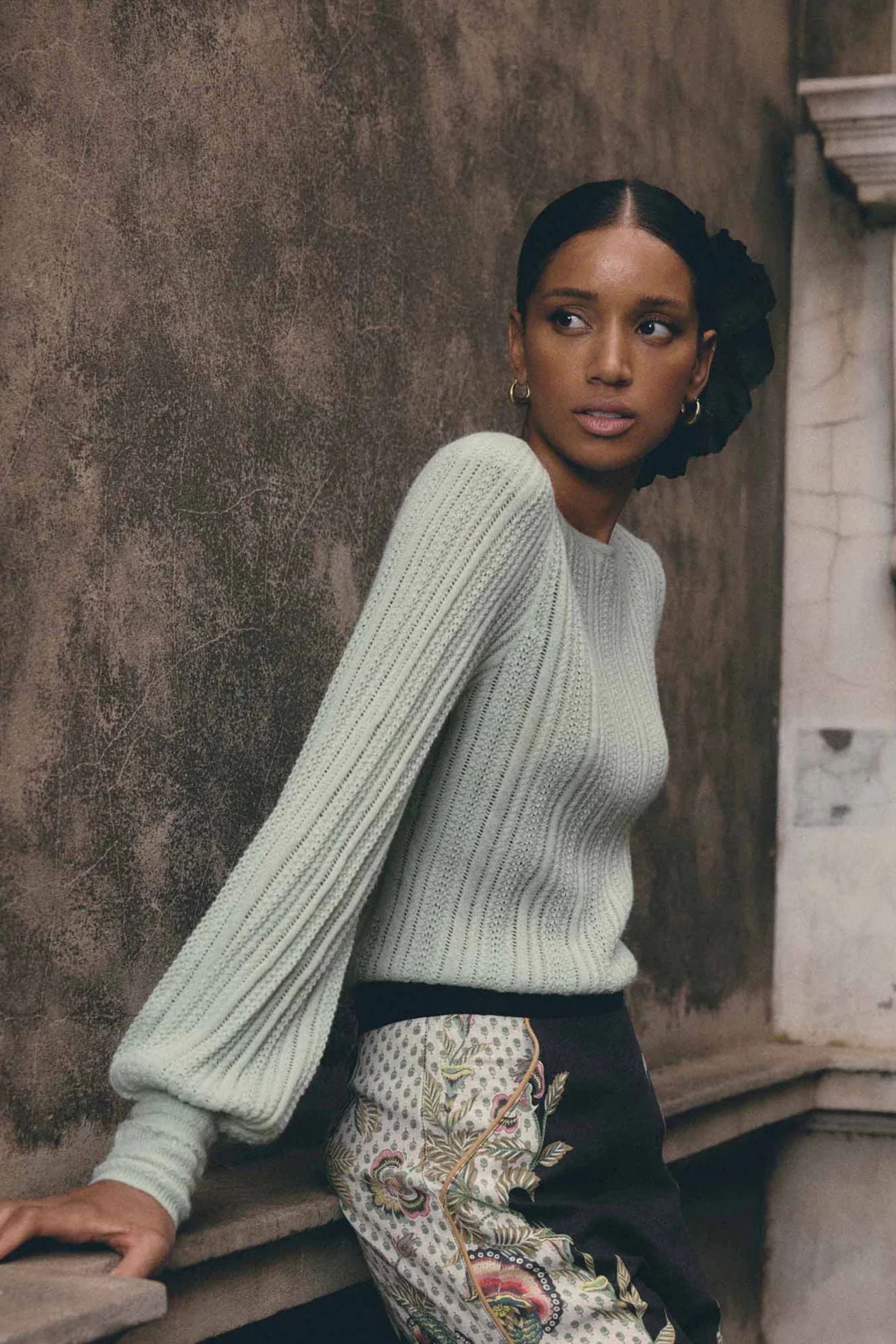 The soft celadon green hue adds a subtle yet striking touch, perfect for elevating any outfit. With romantic balloon sleeves and a slim fit bodice, this knit top creates a beautifully balanced silhouette that exudes modern femininity with a touch of vintage charm.