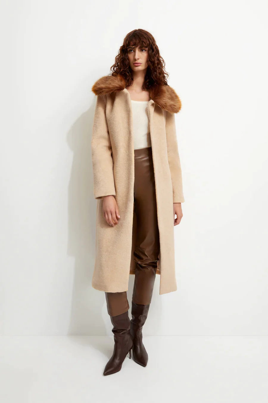 AN ODE TO VINTAGE GLAMOUR, THE SPICE COAT IS A TIMELESSLY ELEGANT STYLE CRAFTED FROM LUXE VEGAN WOOL AND FAUX FUR. IT OFFERS A MIDI LENGTH HEMLINE AND A CONTRAST COLLAR MADE FROM PLUSH FAUX FUR FOR ADDED WARMTH.