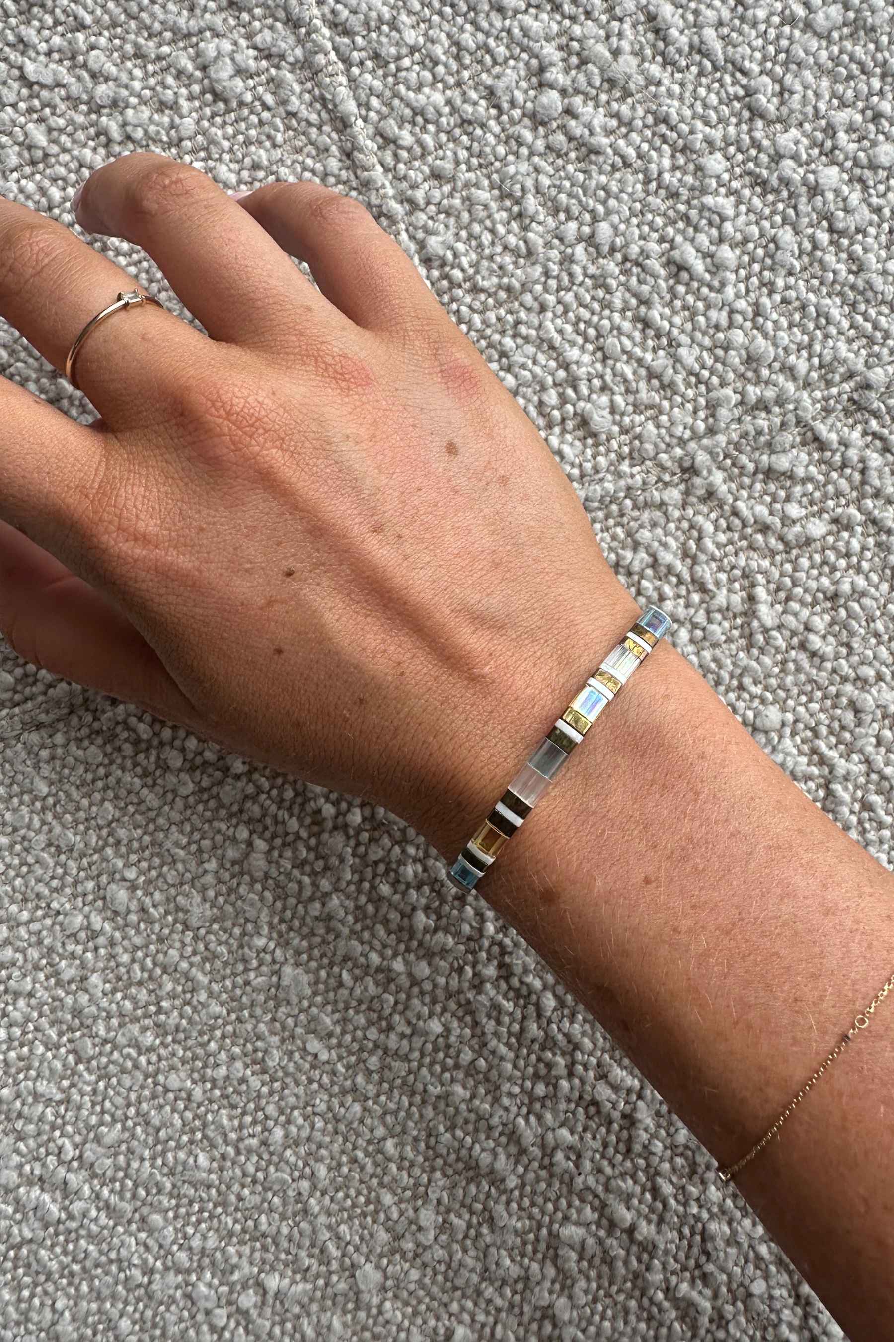 This water-resistant bracelet features elastic tile beads in striking colours, adding a pop of vibrant elegance to your wrist. Designed to withstand everyday activities, the Tile Bracelet is perfect for both active lifestyles and casual wear. Its comfortable elastic construction ensures a secure and adjustable fit for all-day comfort.