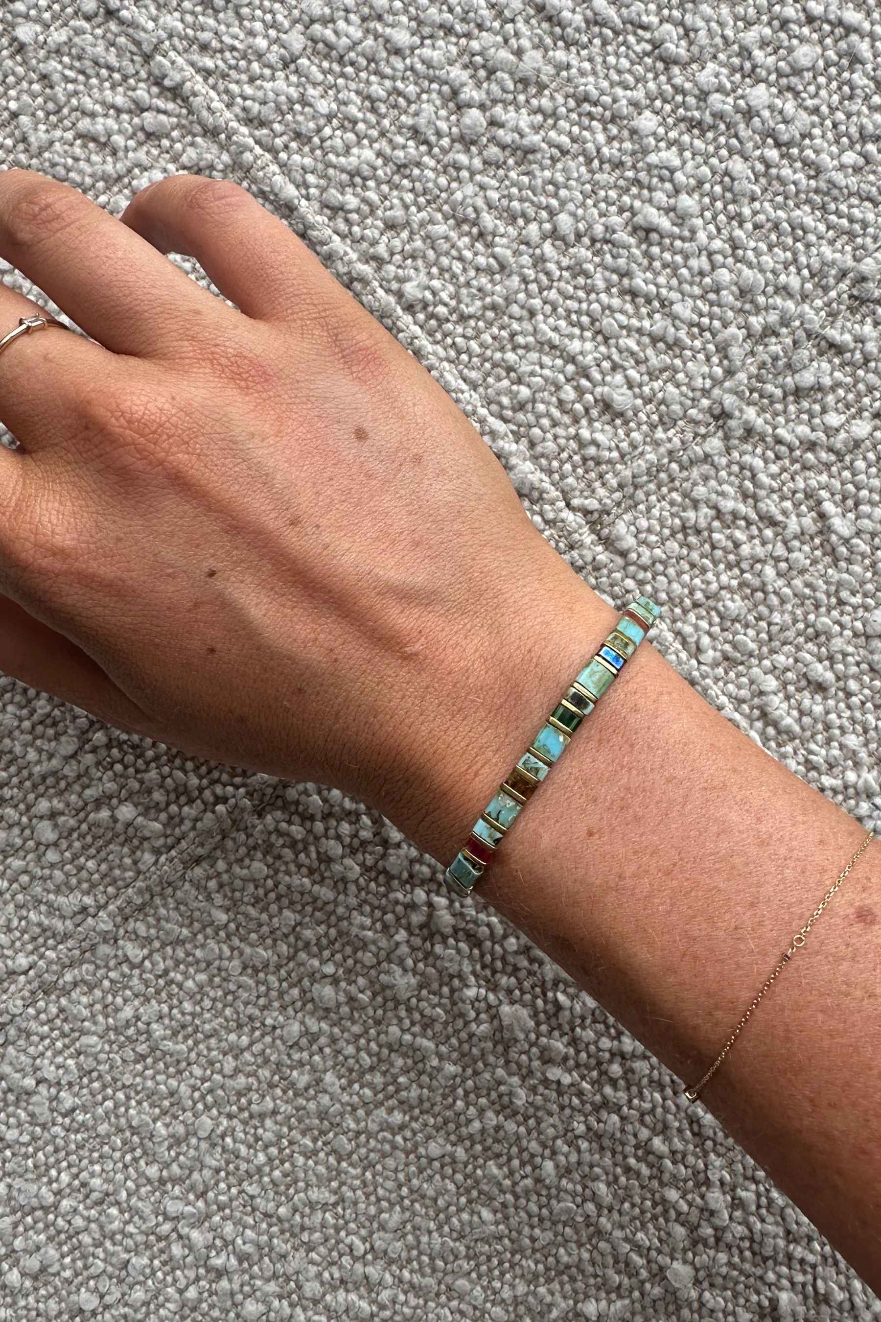 This water-resistant bracelet features elastic tile beads in striking colours, adding a pop of vibrant elegance to your wrist. Designed to withstand everyday activities, the Tile Bracelet is perfect for both active lifestyles and casual wear. Its comfortable elastic construction ensures a secure and adjustable fit for all-day comfort.