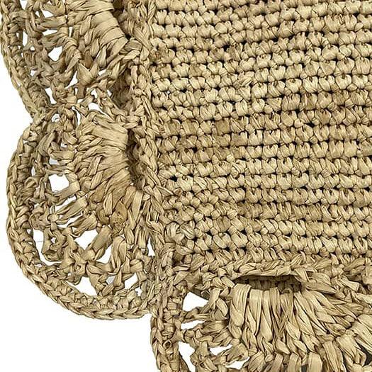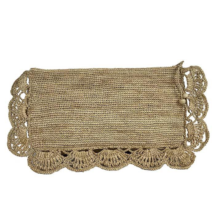 Our Toky clutch combines the double crochet stitch with a delicate flower ruffle – the zip keeps your belongings safe and the 100% cotton linen gives softness – hand harvested, hand made and woven from durable, sustainably harvested raffia fibers