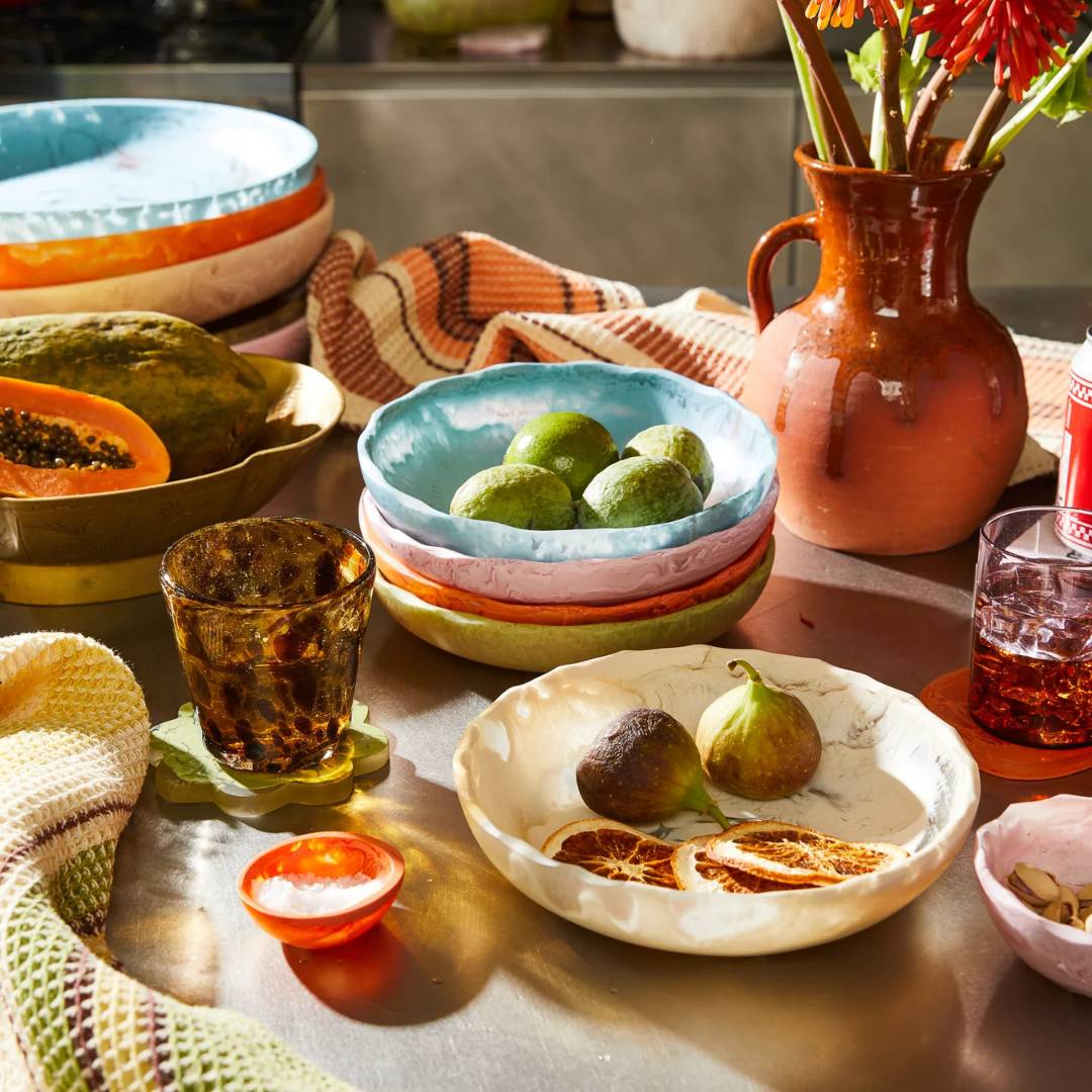 “The Toni Bowl has a shallow silhouette that’s perfect for grain salads and mezze spreads. Reimagined here in our stunning Vanilla colourway – swirling together a classic cream and transparent resin for a refined statement.” – Phoebe’s Style Notes