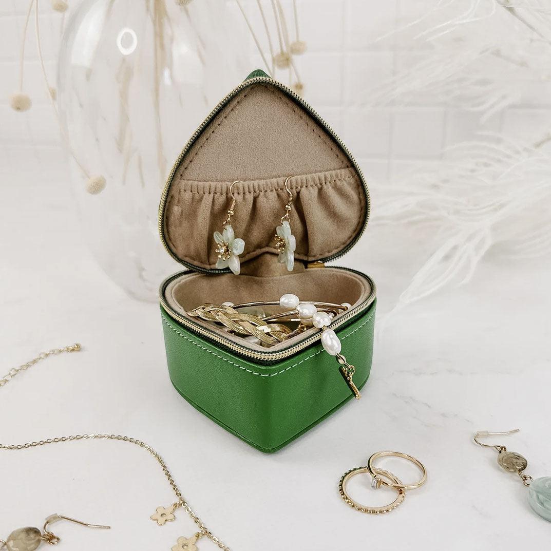 The Louenhide Valerie Apple Green Jewellery Box is the perfect travelling accessory to store your beloved jewellery collection. Keep your essentials organised and at the ready, in this cute jewellery case. Thoughtfully designed with an elasticated pocket for small rings or earrings and compartment space for your larger items. A thoughtful gift for bridesmaids, birthdays or someone special in your life.