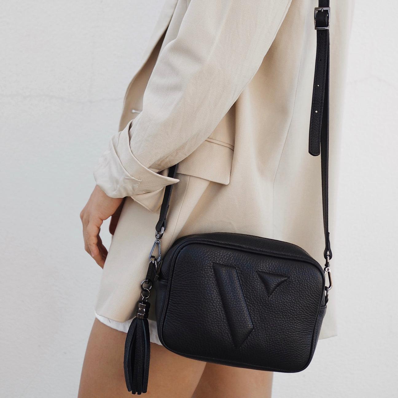 The ultimate leather crossbody bag to take you from day to night. VANESSA's classic silhouette will complement any outfit, perfect to dress up or down. A statement VESTIRSI "V" is subtle enough to make a chic impact. Surprisingly spacious, VANESSA is roomy enough to fit all your essentials including a large smartphone, full-sized wallet, keys, sunglasses, lipstick and more. Handcrafted in Italy from luxury Italian pebbled leather, VANESSA's adjustable crossbody strap can be removed should you want to wear her as a clutch and her clip-on tassel can be removed if you prefer a more pared back look.