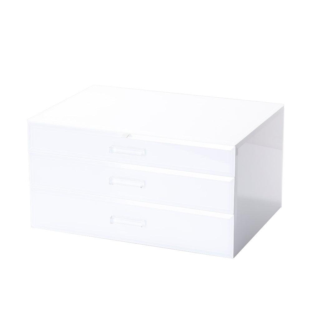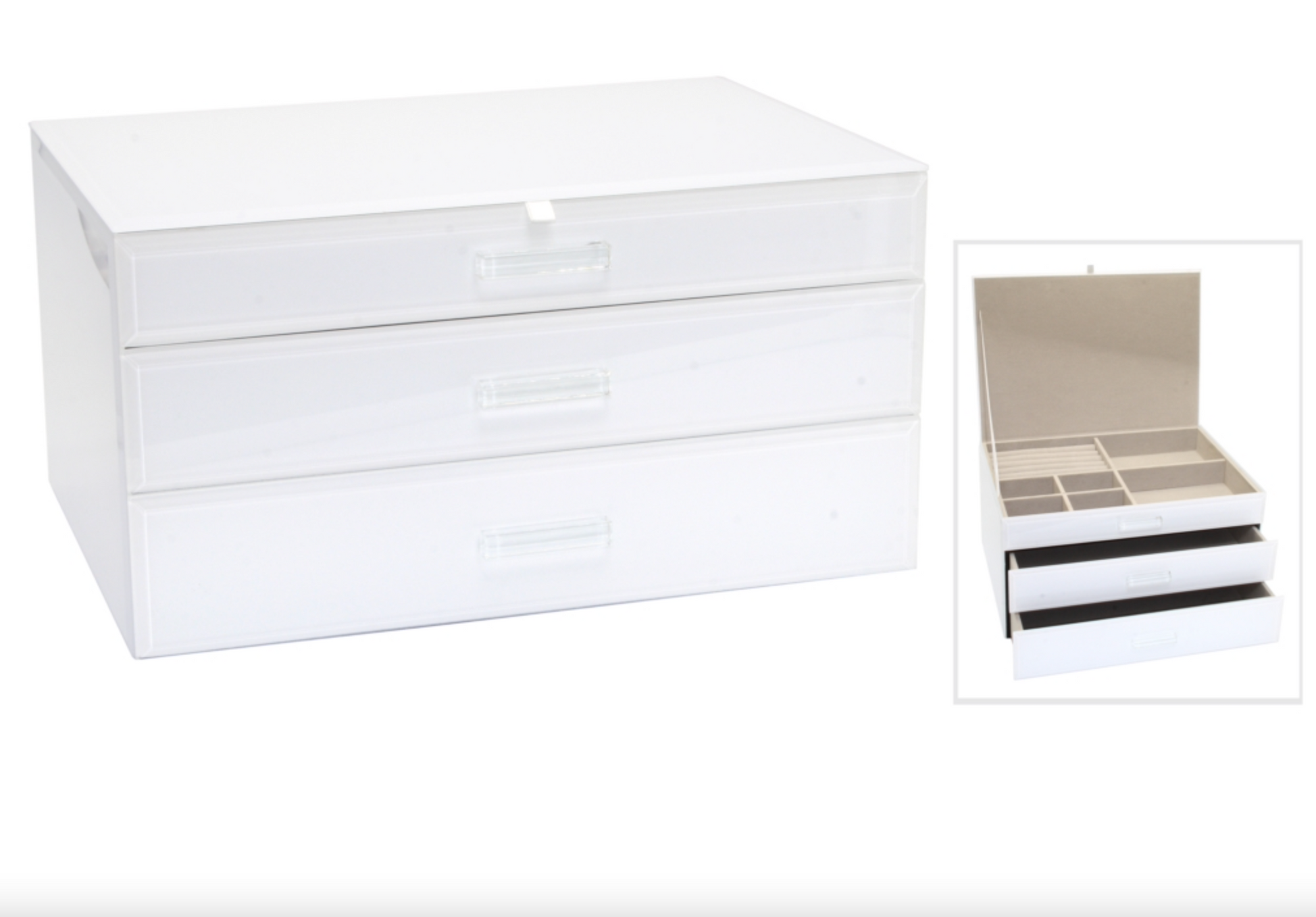 Functionality meets fabulous style with this glass jewellery box. It features three tiers: one compartmentalised top section plus two removable drawers, so there's plenty of room for rings, earrings, bracelets and necklaces. Every item will be safely stored, neatly arranged and set against tactile velvet to protect it from scratches. The glass box will glisten in the light to bring an air of vintage glamour to your vanity table. What more could a girl want?
